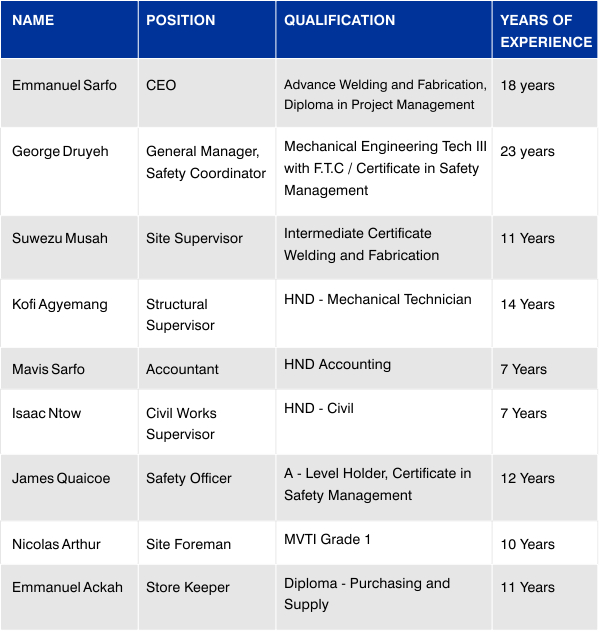 Our company is managed and administered by the following persons whose vast experience in engineering, project and finance, combined with impressive levels of competence and techniques, has enabled the company to render services to match the requirements of our customers.